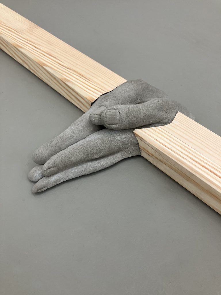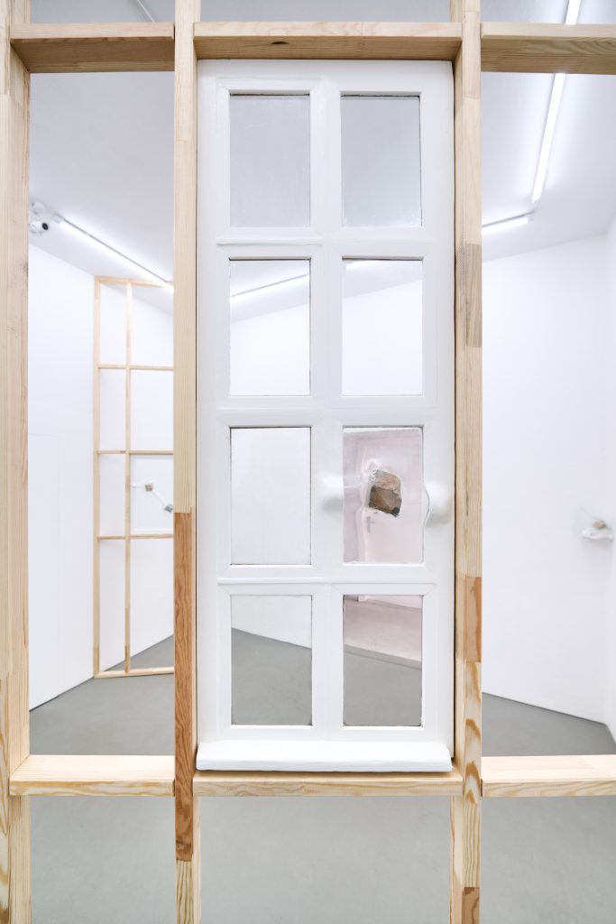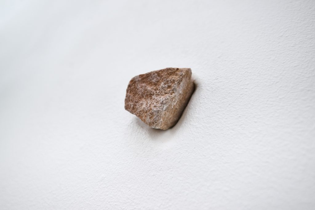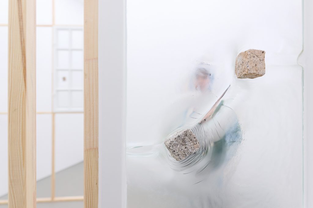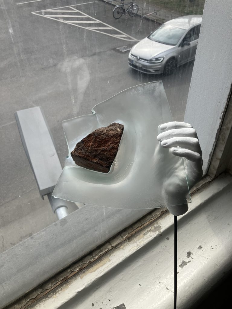 So, what do we see in this exhibition? Windows, for sure, and stones, and hands that may have picked them up from the street. And glass, of course. But what kind of glass? What kind of glass doesn’t shatter into a thousand pieces when struck by a stone, but instead bends on impact, em- bracing the stone like a protecting hand—as if it seeks to soothe the violence, to help it overcome its anger through affection, or even love?